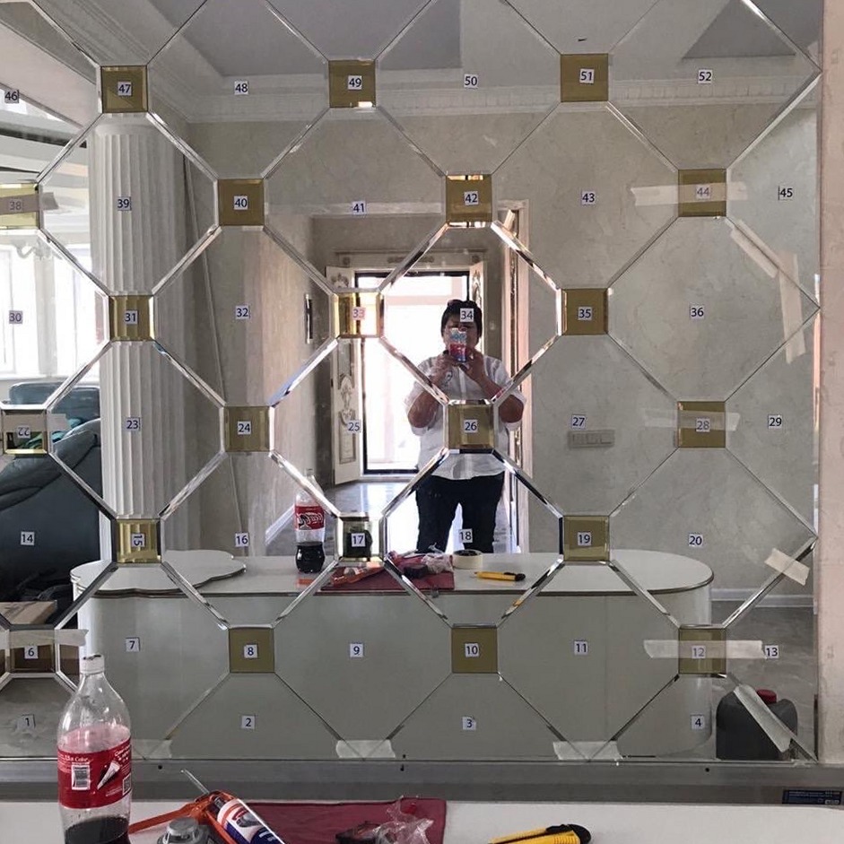 Зеркальное панно в салоне, Москва, серебристая зеркальная плитка "восьмиугольник" и золотистая зеркальная плитка квадратной формы