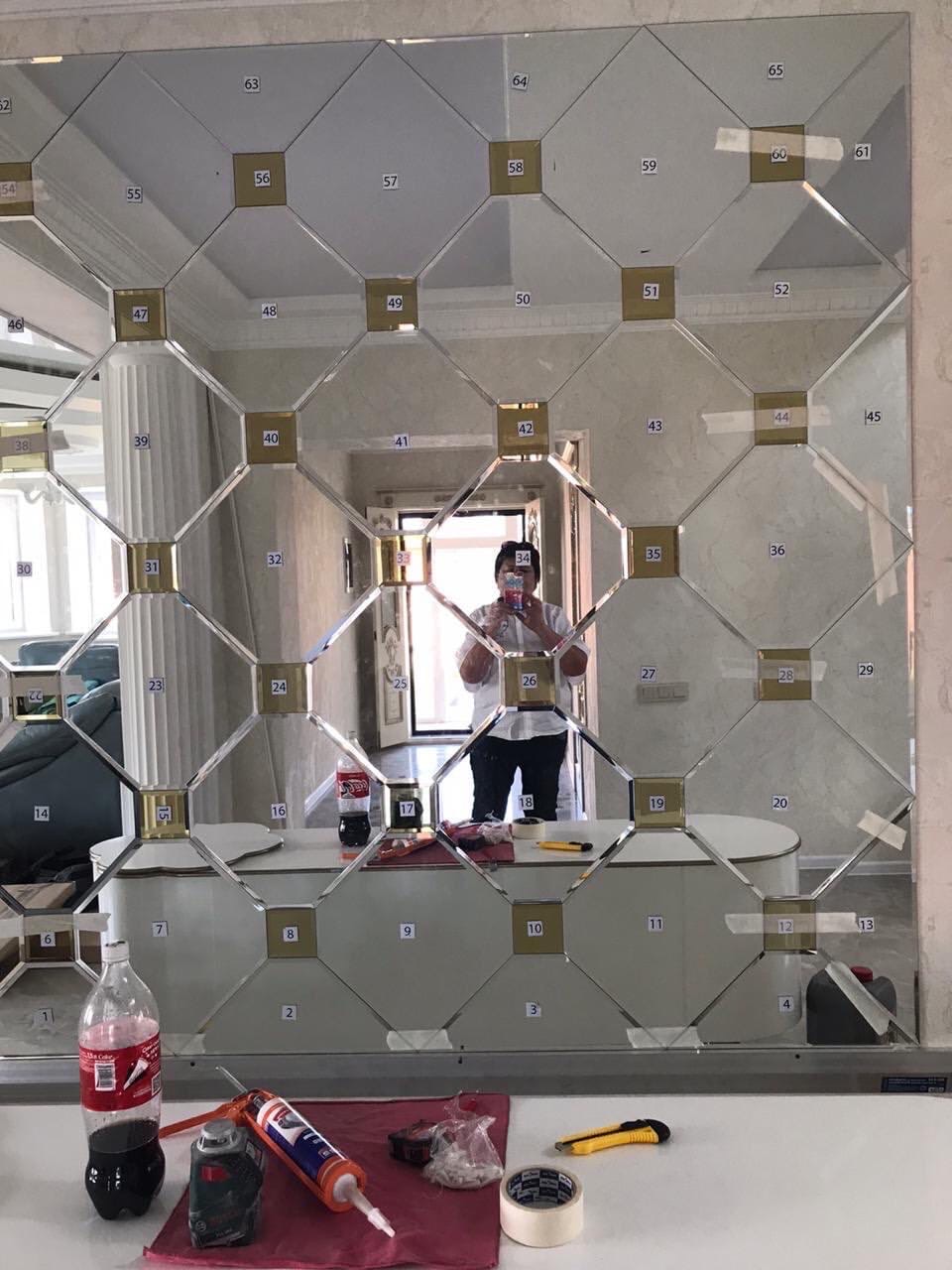 • Проект Зеркальное панно в салоне, Москва, серебристая зеркальная плитка "восьмиугольник" и золотистая зеркальная плитка квадратной формы фото проекта